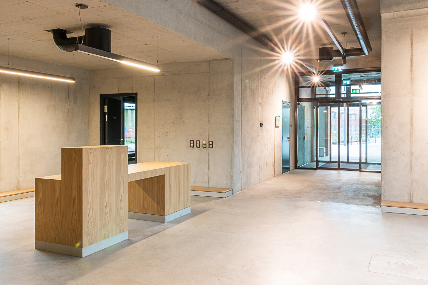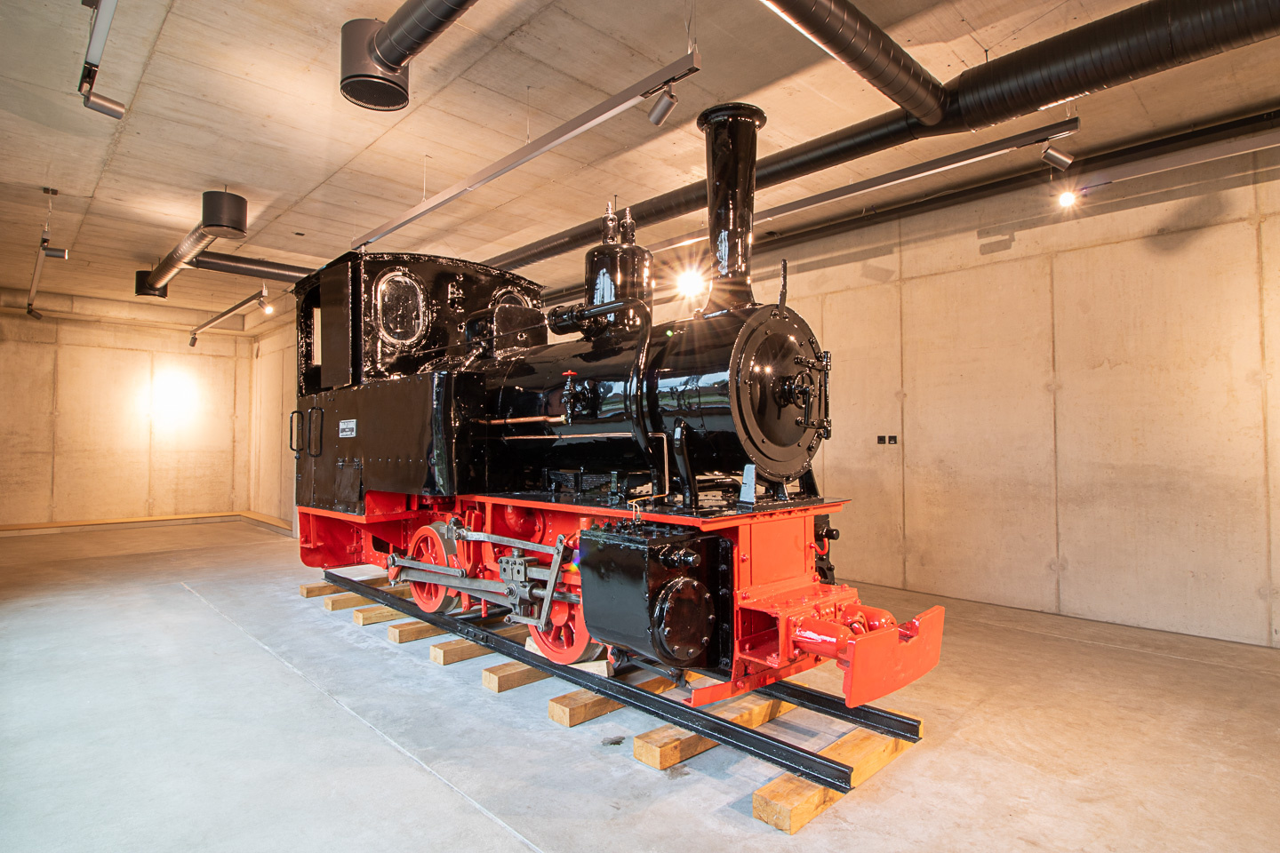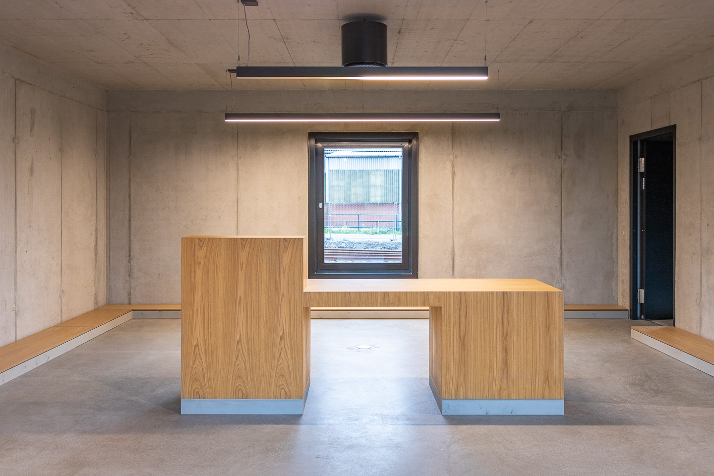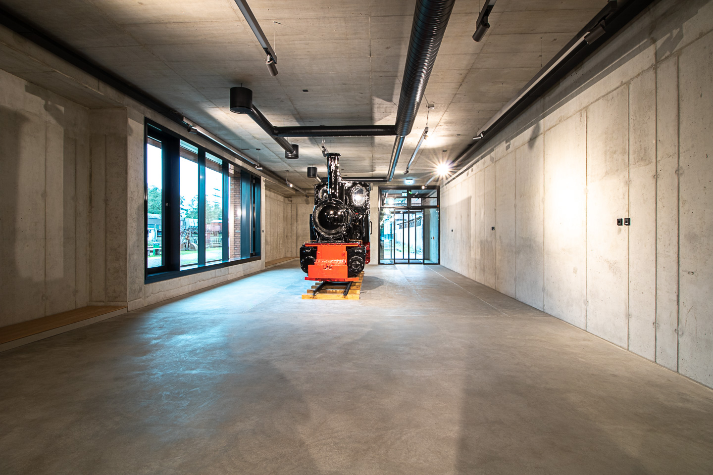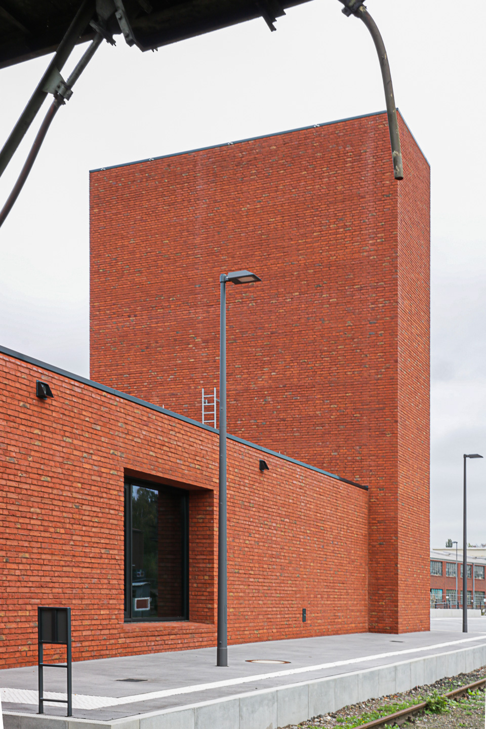 Das 1977 gegründete Eisenbahnmuseum in Bochum-Dahlhausen ist eines der größten Museen seiner Art in Deutschland. Historische Schienenfahrzeuge und denkmalgeschützte Gebäude zeugen hier von der Historie des technischen Fortschritts. Dem Museum verschafft der Neubau eine klare Eingangssituation, die den Besucher in das weiträumige Außengelände leitet. Der eingeschossige Ziegelbau mit der turmartig emporragenden Eingangsfront fügt sich als skulpturaler Körper in das Areal ein. Mit dem vorgelagerten Museumsbahnsteig bildet er eine Figur, deren Dynamik den Schwung der umgebenden Gleisanlagen nachzeichnet. Beton, Stahl und Klinker nehmen das Echo der alten Eisenbahngebäude und des von Schwerindustrie geprägten Ruhrgebiets auf und schreiben es in einer zeitgenössischen Architektur fort. Der monolithisch wirkende Turm dient als Foyer und Landmarke mit Signalfunktion zugleich. Er eröffnet den Blick in den schmalen, langgestreckten Museumsraum, der erste Ausstellungsstücke präsentiert und sich durch ein großes Fenster auf die Gleise öffnet. Roher Sichtbeton verleiht dem Innenraum industriellen Charakter, die sichtbar verlegte Technik betont dabei den linearen Raumfluss. Als Reminiszenz an das Holz alter Bahnschwellen sind alle eingebauten Möbel in Eichenholz gefertigt.