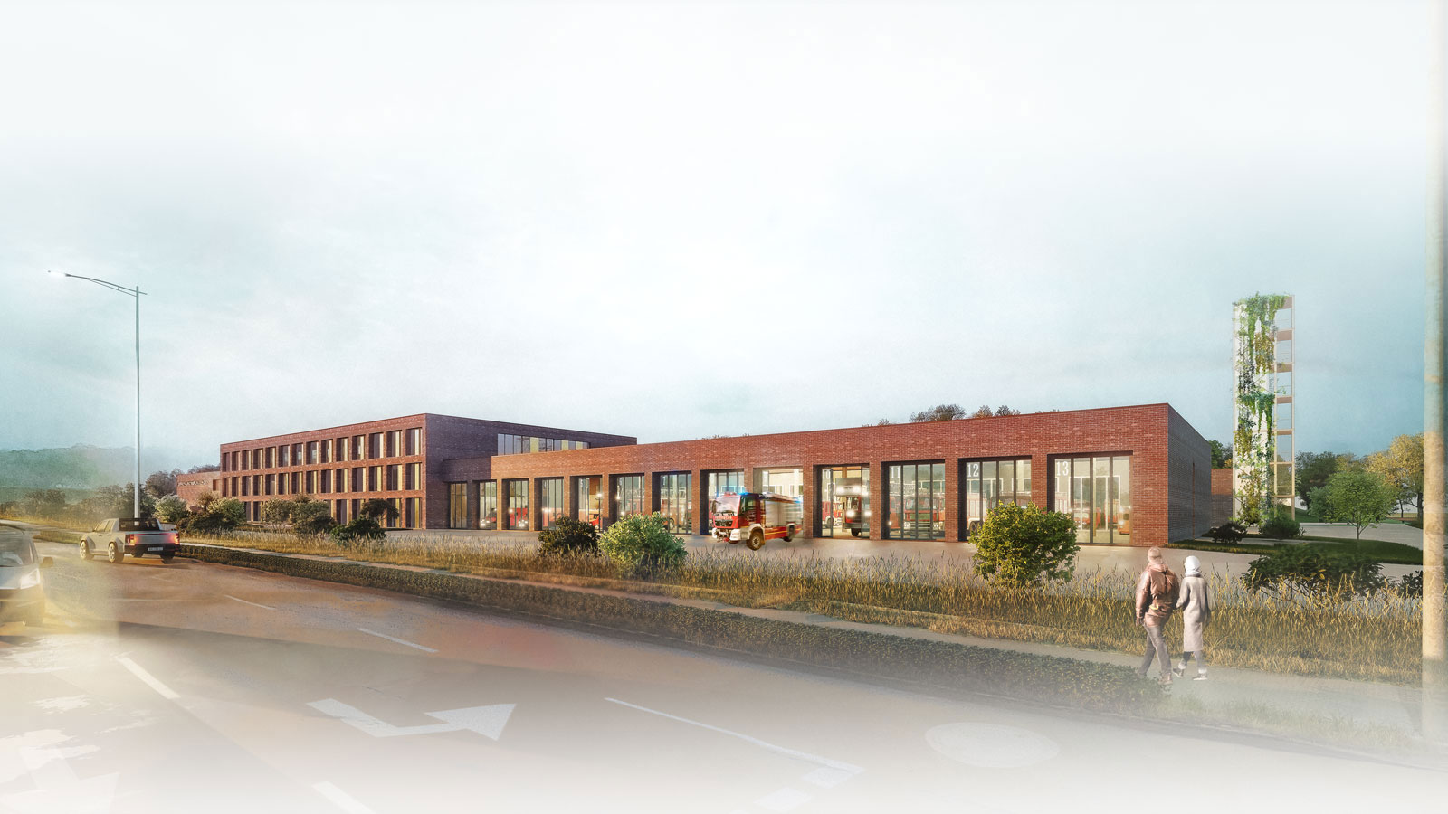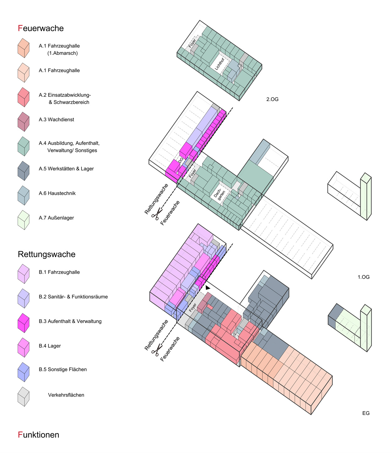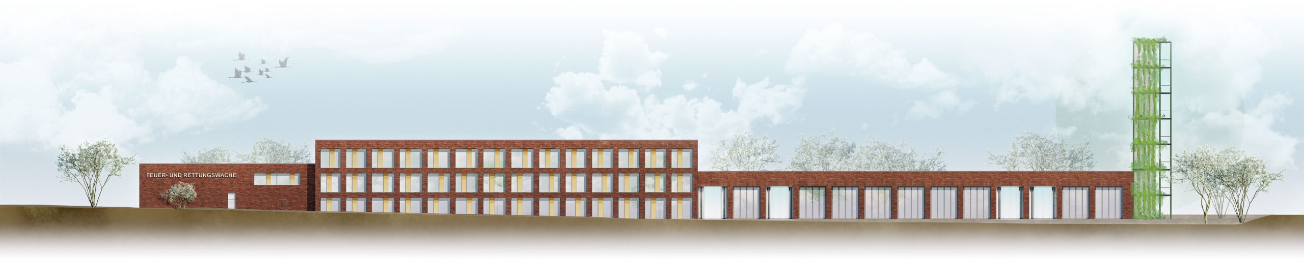 Der vorliegende Entwurfsansatz positioniert die Nutzungseinheiten der Feuer- und Rettungswache entlang der Landesstraße Nordlandwehr. Die Fahrzeughallen sind so angeordnet, dass die gewünschte Alarmausfahrt an der Nordlandwehr auf kürzestem Wege erreicht werden kann.