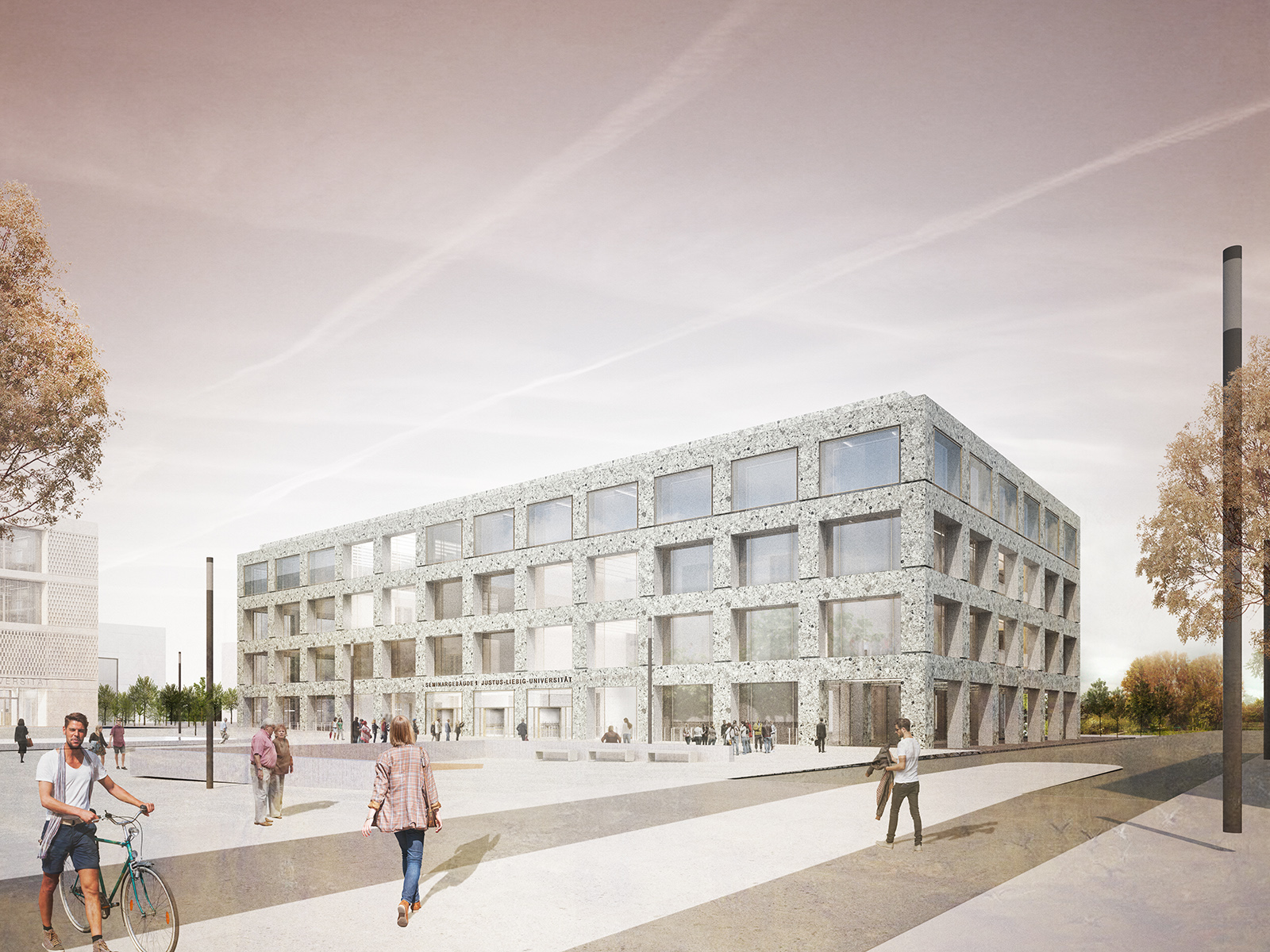 Nach einem Entwurf von Max Dudler bildet das Seminargebäude I mit seiner klaren Geometrie und kompakten Erscheinung einen markanten Baustein der Neuen Mitte des künftigen Campusbereichs Philosophikum der Justus-Liebig-Universität Gießen. Die streng gegliederte Fassade wirkt ruhig und präzise, öffnet sich jedoch über großzügige Verglasungen und gibt Einblicke in die offen organisierte innere Struktur. Das sichtbare Tragwerk im Inneren spiegelt die architektonische Klarheit des Entwurfs wider und prägt den sachlichen Raumcharakter.