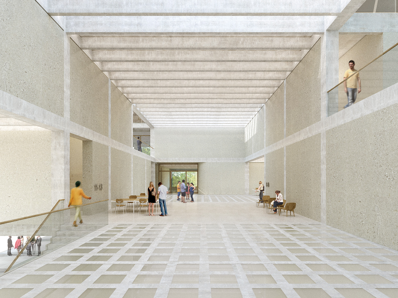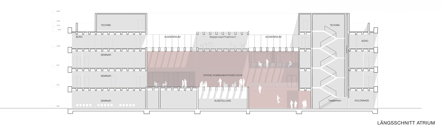 Vom Haupteingang am Campusplatz aus entfaltet sich der Innenraum als zusammenhängende Raumlandschaft, die alle Seminarbereiche miteinander verbindet. Über mehrere Ebenen entstehen differenzierte Aufenthalts- und Arbeitszonen mit unterschiedlichen räumlichen Qualitäten. Das Gebäude wird so gleichermaßen Ort der Begegnung und Kommunikation wie Haus des konzentrierten Arbeitens. Ein großzügiges Foyer mit zweigeschossigem Luftraum führt in den zentralen Arbeitsbereich im ersten Obergeschoss, der als offener Treffpunkt der Studierenden und als Knotenpunkt der inneren Erschließung dient. Die Bauleitung für den Neubau wurde durch Vervoorts & Schindler Architekten BDA übernommen.