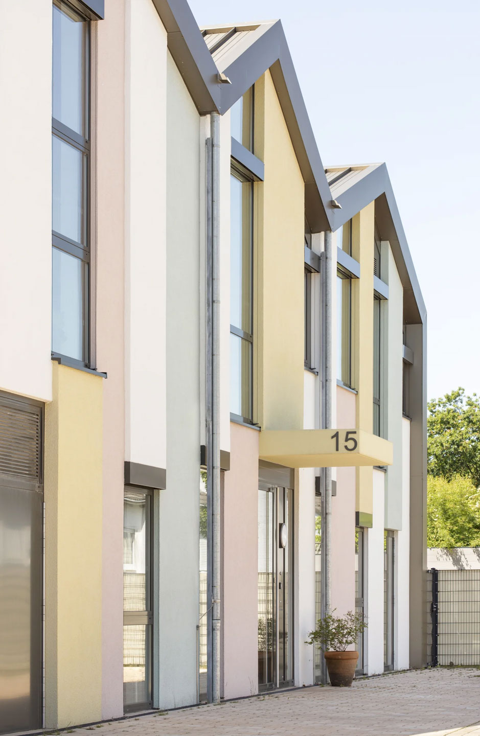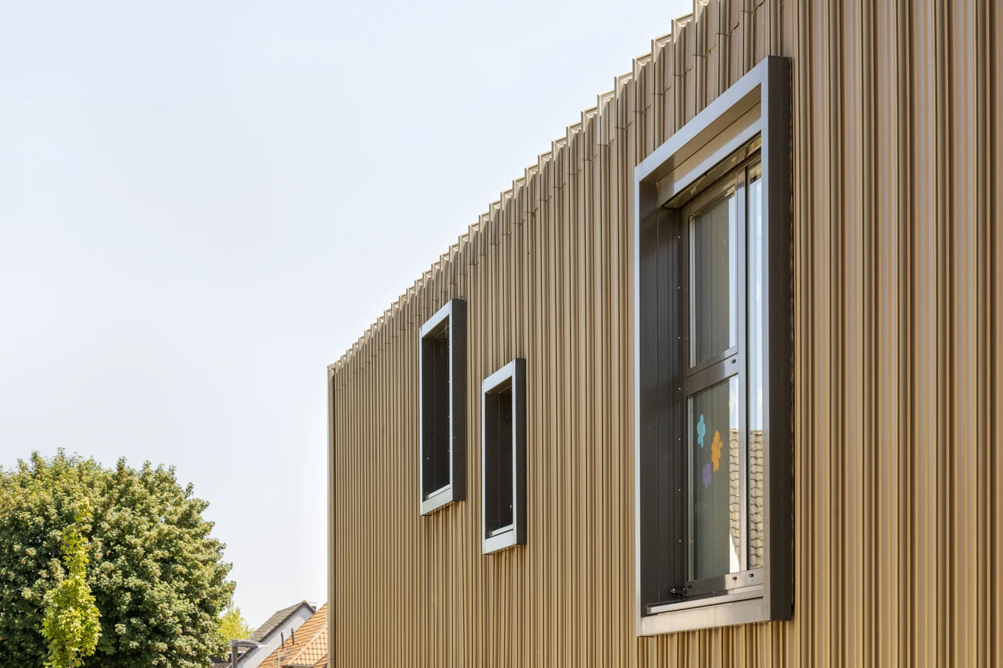 Im Gegensatz zu den sie öffnenden farbig gestalteten Putzfassaden auf der Ost- und Westseite, wirken die dem öffentlichen Raum zugewandten Fassadenfläche der Südseite eher introvertierten. Wie ein Tuch legt sich die Fassade bindend über die „3 Häuser“ und verleiht dem quadratischen Grundriss eine Richtung. Fenster- bzw. Dachöffnungen sind frei in die metallische Gebäudehülle aus „goldenen“ Aluminium-Fassadenbahnen eingestreut, sensibel detailliert und erzeugen so in Verbindung mit der Struktur des Materials und der seiner Farbgebung ein spannungsreiches Erscheinungsbild.