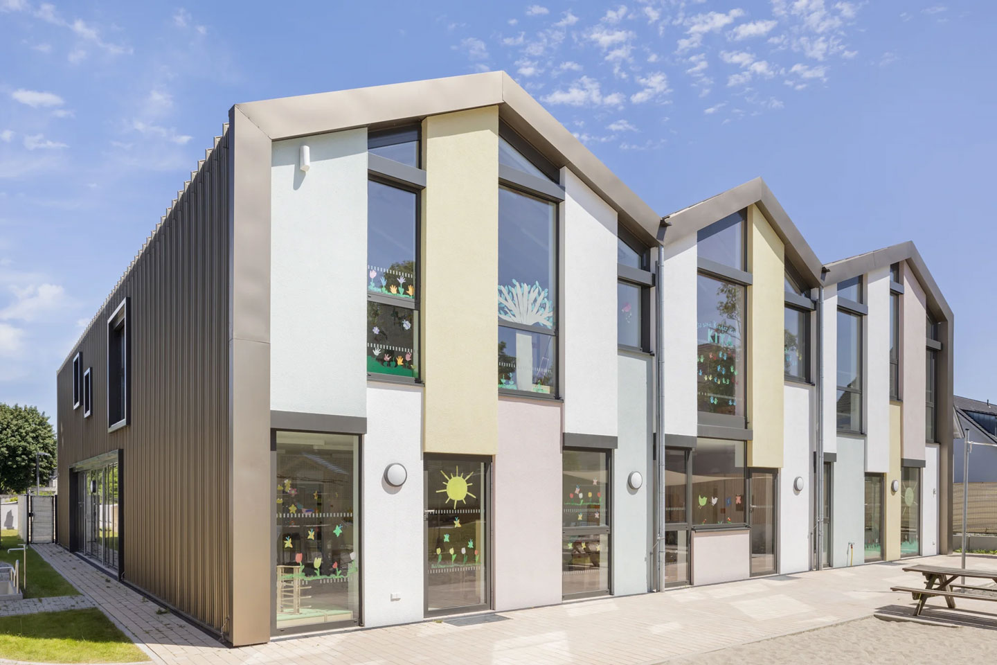 Über den zum Parkplatz orientierten Haupteingang an der Ostseite, betritt man das zweigeschossige Haus und gelangt in eine offene Halle mit Treppe und Aufzug. Über diese zentrale Erschließungsachse werden die beiden Gruppenräume und die Funktionsräume erschlossen. Zugleich ist sie als Spielflur gedacht. Direkt am Eingang, mit Abstellgelegenheit für die Kinderwagen, befindet sich das Büro der Leitung. Im östlichen Teil des Hauses sind, in einer Nutzungseinheit gebunden, die dienenden Räume der Einrichtung untergebracht. Alle Aufenthaltsräume im EG verfügen über einen direkten Zugang nach draußen.