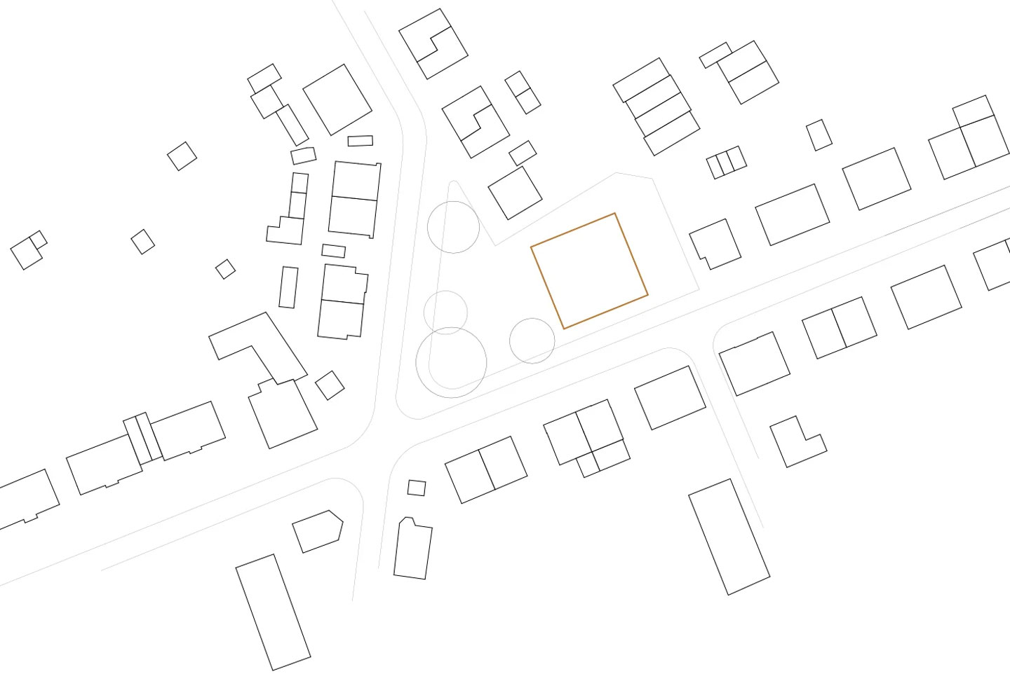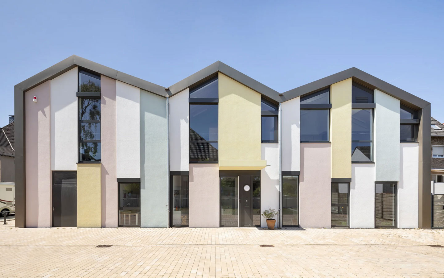 Das Gebäude nimmt die städtebaulichen Bezüge auf, schließt die Ecke und reiht sich in die vorhandene Struktur ein. Mit seiner Höhenentwicklung und ausgeprägten Dachform, orientiert sich der Neubau an den Gebäudebeständen und schreibt diesen logisch fort. Die Gestaltung der Fassaden greifen im Maßstab ebenfalls Vorhandenes auf und interpretieren dies spielerisch mit Bezug auf die angedachte Nutzung.