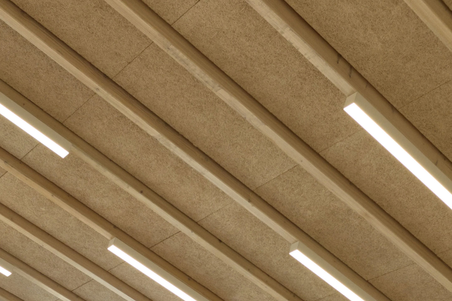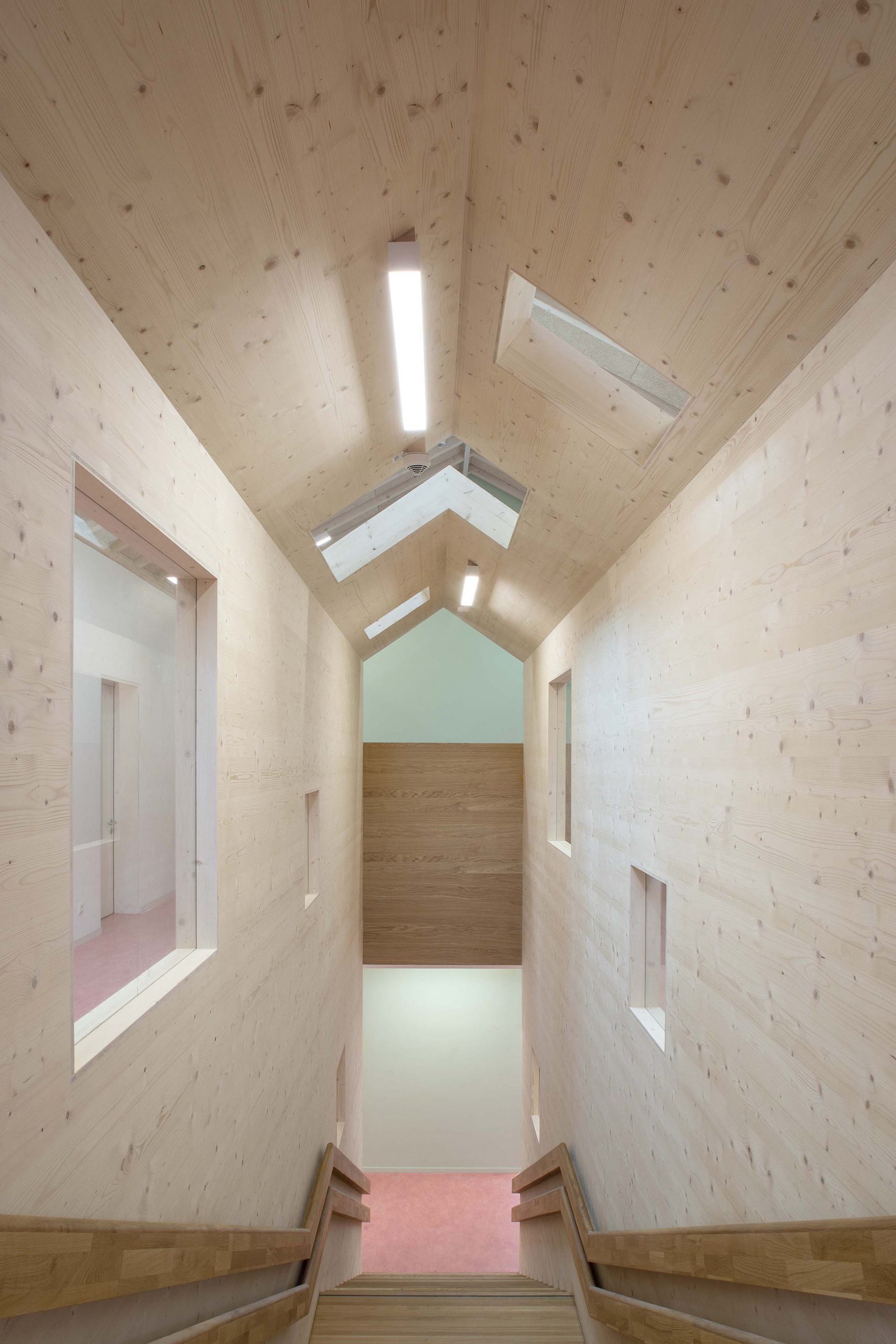 Auf aussenliegende Treppen für den zweiten Rettungsweg wurde bewußt verzichtet. Das Obergeschoss beherbergt einen dritten Gruppenraum sowie den großen Mehrzweckraum. In allen Räumen ist die Dachlandschaft wahrnehmbar und sorgt für Orientierung. Eingestellte, hölzerne Konstruktionen bilden nach dem „Haus im Haus“ Prinzip Raumangebote für verschiedene Nutzungen und folgen dem Grundthema des Entwurfs. Neben der dezenten, akzentuierten Farbigkeit der Boden- und Wandflächen, tragen die geseiften Holzoberflächen maßgeblich zu positiven Wirkung der Innenräume bei.