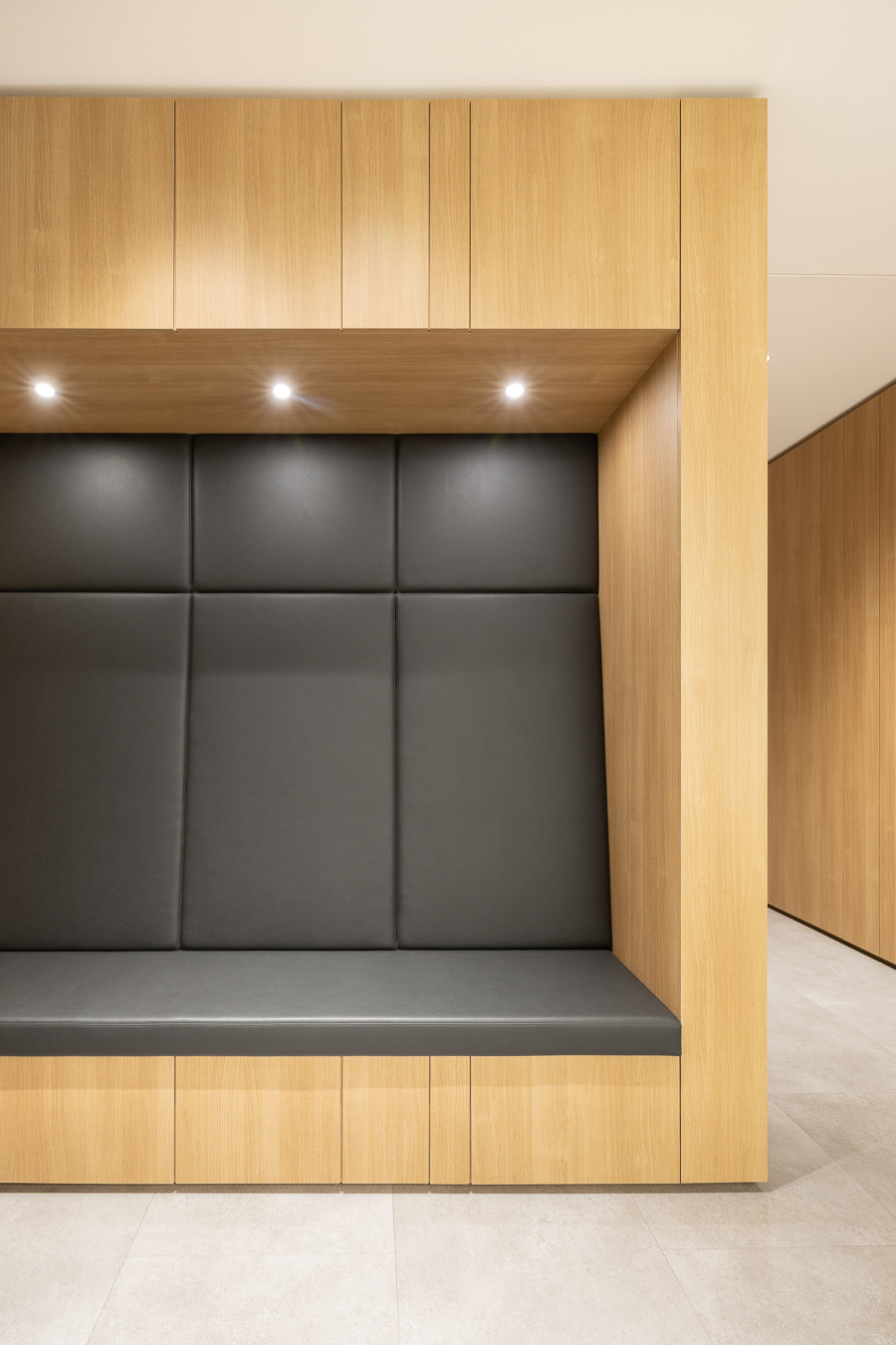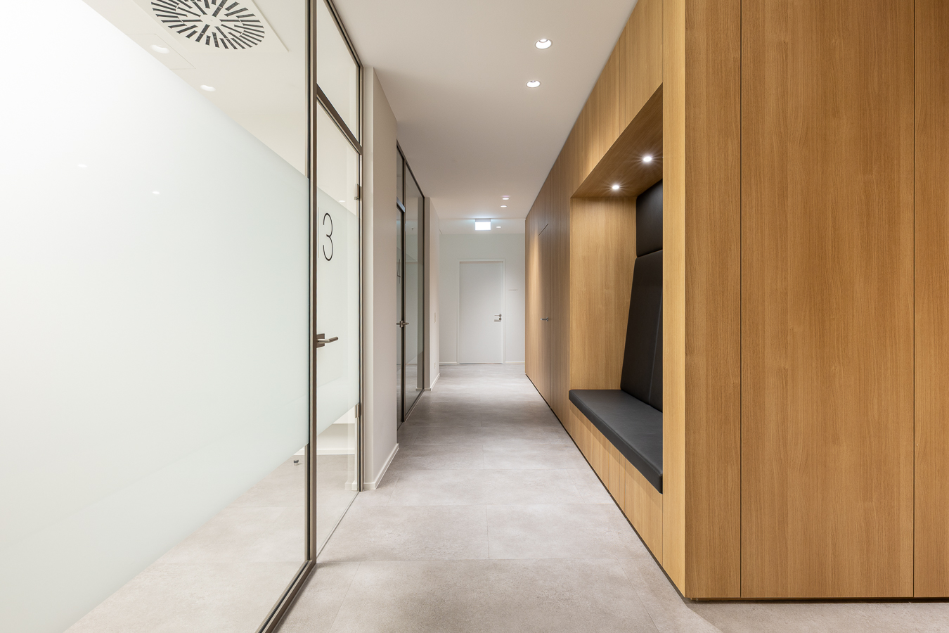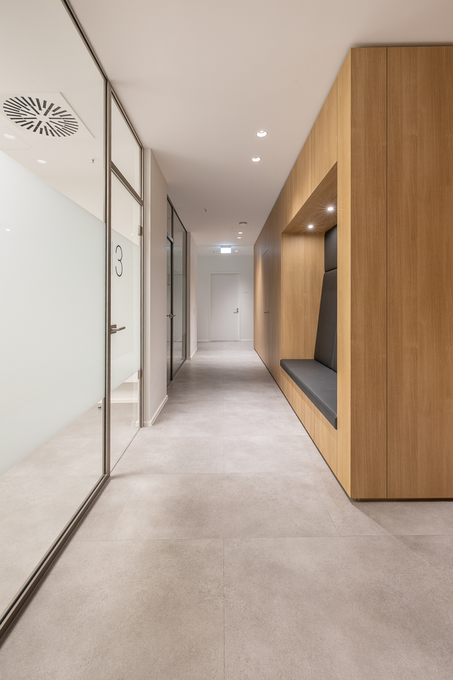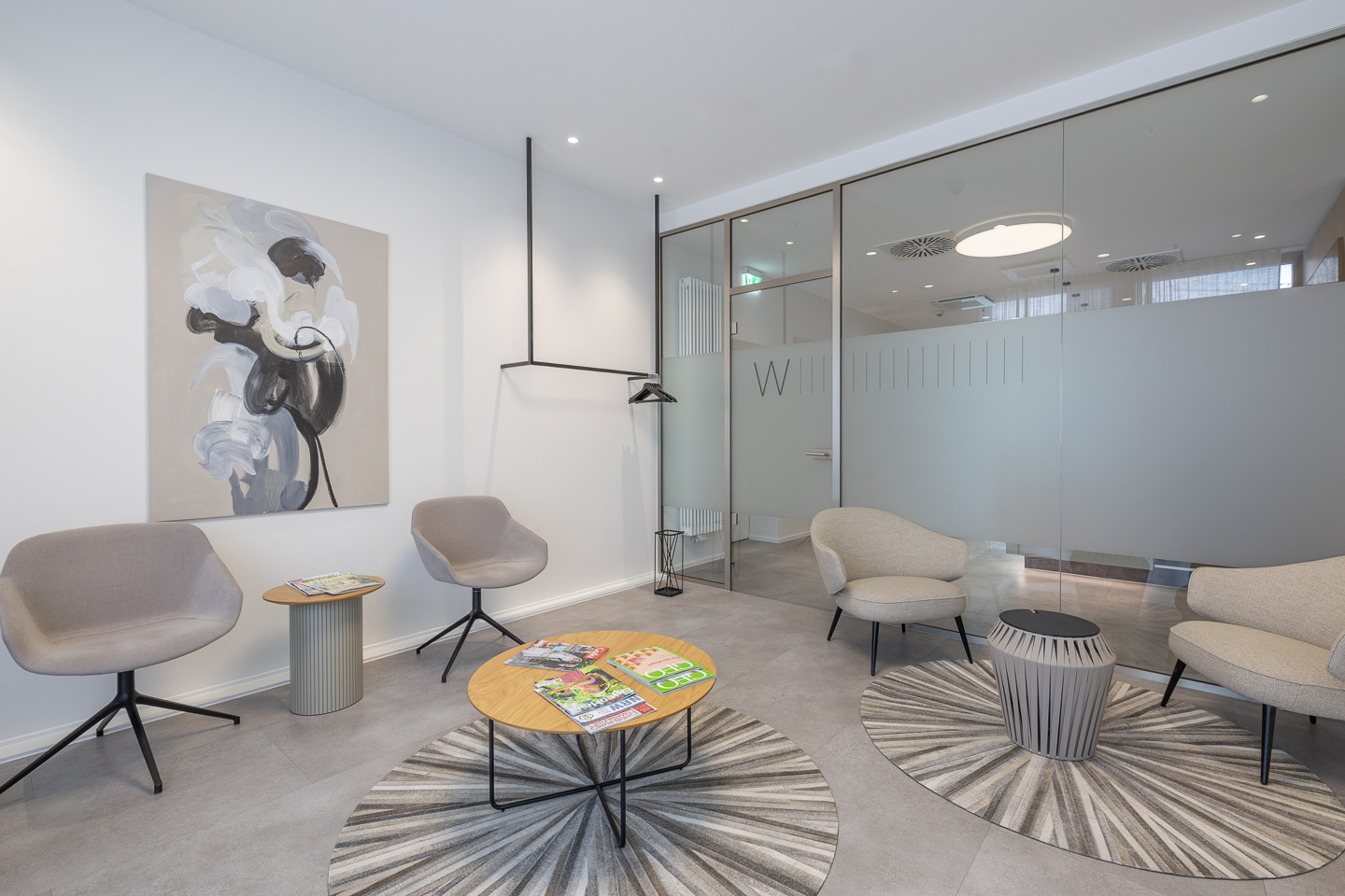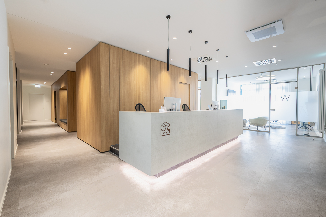 Die Material- und Farbwahl ist bewusst zurückhaltend. Viel Glas und gezielte Lichtführung sorgen für helle, klare Räume mit ruhiger Atmosphäre. Die Bodenbeläge aus hochwertigem, strapazierfähigem PVC erfüllen sowohl gestalterische als auch hygienische Anforderungen. Insbesondere der Wartebereich ist modern, hochwertig und einladend gestaltet.