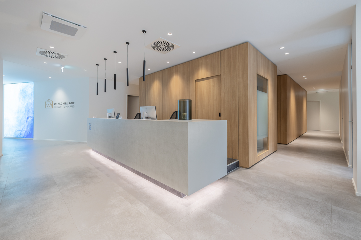 Im denkmalgeschützten Kortumhaus in zentraler Bochumer Innenstadtlage haben wir eine oralchirurgische Praxis realisiert. Grundlage war der Entwurf des auf Praxisplanung spezialisierten Innenarchitekturbüros Schenk aus Karlsruhe. Unsere Aufgabe lag in der vollständigen Umsetzung des Projekts in der Objektüberwachung – von der baulichen Umsetzung über die Koordination der Fachgewerke bis hin zur Einhaltung der hohen technischen, hygienischen und denkmalpflegerischen Anforderungen.